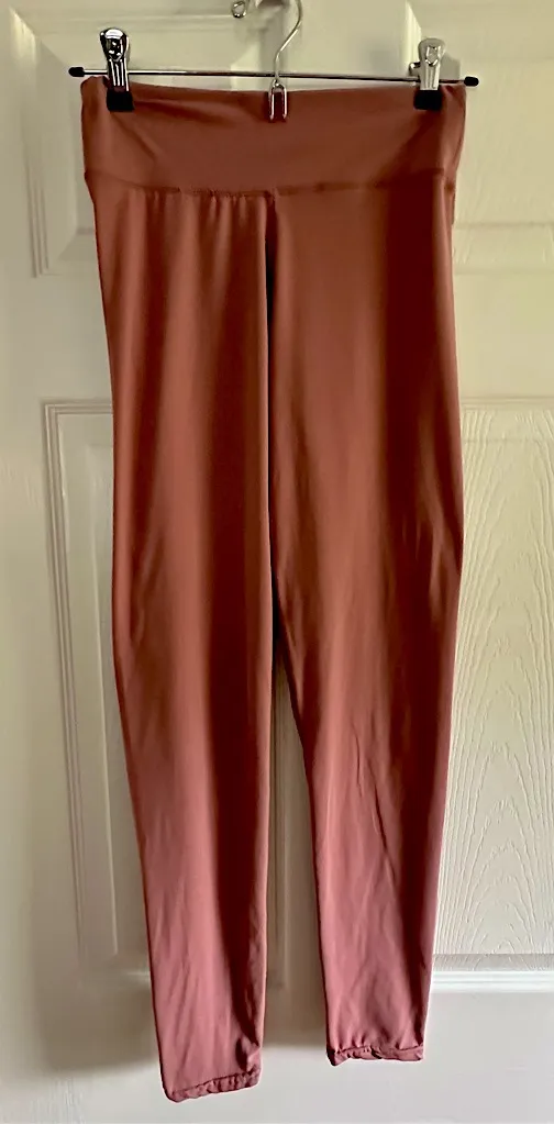 These stylish and comfortable Mauve Pink athleisure leggings are perfect for yoga, casual wear, errands, or lounging. Made from a soft, stretchy knit (92% polyester/8% spandex), they feature a high waist/wide waistband, full-length legs, and a smooth, second-skin feel and offer a flattering, figure-hugging silhouette. A versatile everyday style piece that pairs effortlessly with oversized sweaters, tunics, or athletic tops. Brand: Brand Tag removed; One Size Label visible Style: High Waist Leggings / Yoga Pants Size: One Size Fits Most (See measurements below for comparison) Fabric: 92% Polyester / 8% Spandex Color: Mauve Pink / Dusty Rose Condition: Good condition—NOTE: Has a small stain near the bottom of one leg as shown. From a smoke-free, dog-friendly home Measurements (Lay Flat, Unstretched): Waist: 12 inches Rise: 10 inches Inseam: 27 inches #Leggings #Activewear #Athleisure #Mauve #DustyRose #HighWaist #YogaPants #OneSizeFitsMost