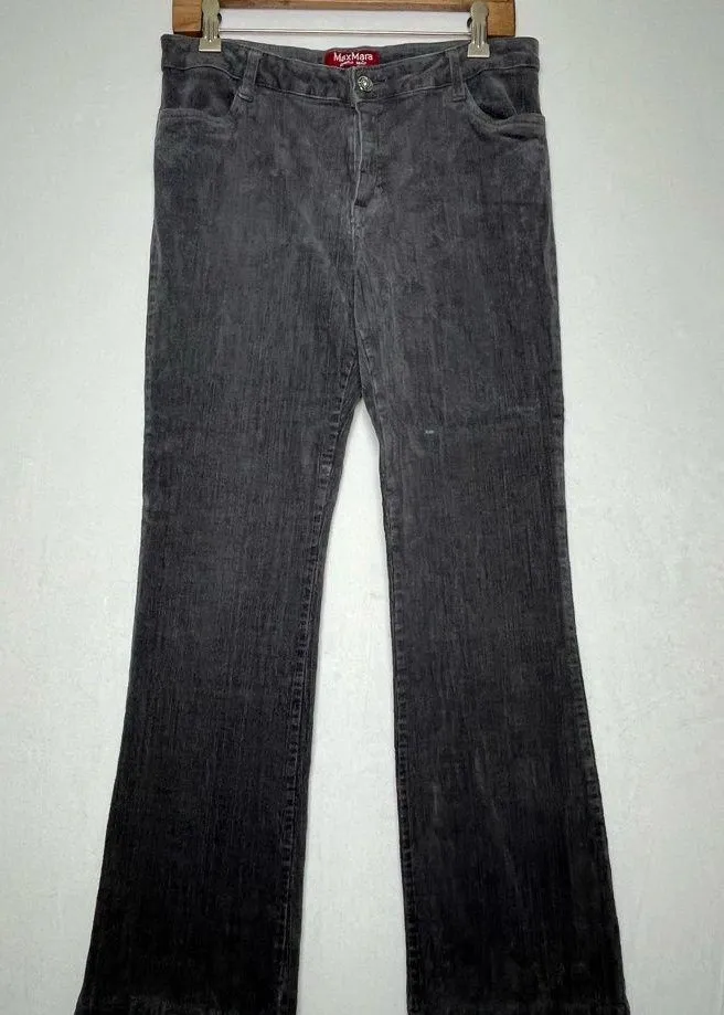 Elevate your wardrobe with these luxurious Max Mara Pura Seta women’s pants, crafted in Italy from a soft, cotton-blend corduroy fabric. These pants feature a mid-to-high rise fit, classic 5-pocket styling, and a slightly flared leg for a timeless silhouette. The rich gray hue and subtle texture make them perfect for both casual and sophisticated looks. Details: • Brand: Max Mara Pura Seta • Size: EU 44 (approx. US 10) • Color: Charcoal Gray • Material: 96% Cotton, 4% Polyester • Closure: Front zip with Max Mara–engraved button • Style: Straight / slight flare leg corduroy trousers • Origin: Made in Italy • Condition: Excellent pre-owned condition – clean, no stains or holes, light general wear consistent with age. • Measurements (approximate): • Waist: 30 in • Rise: 9 in • Inseam: 29 in • Leg opening: 16 in