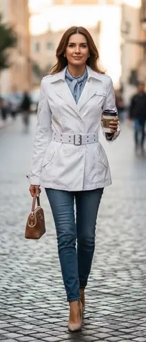 Max Rave Y2K White Double Breasted Short Trench Coat Jacket Belted Womens Size Large cropped trench coat off-white, double-breasted button, Collared, matching fabric belt with a silver-tone buckle, Short trench coat/blazer • Closure: Full button front with two parallel columns of buttons • Belt: Matching, adjustable fabric belt with a silver-tone buckle for a flattering, cinched waist silhouette • Pockets: Dual button-flap hand pockets • Details: Notched lapels, long sleeves with adjustable button-tab cuffs, and epaulets (shoulder tabs) for classic tailoring touches Era: Vintage Y2K (Early 2000s) Y2K Aesthetic White Outerwear Blazer In perfect condition Measurements Total length 23.5” Sleeve Length 22.5” Pit-Pit 17” 55% Nylon 45% Cotton HARD TO FIND ! Belted peplum jacket, Military-style jacket, Utility Jacket Classic/Timeless, Military-inspired Clean Girl / minimalist and polished aesthetic