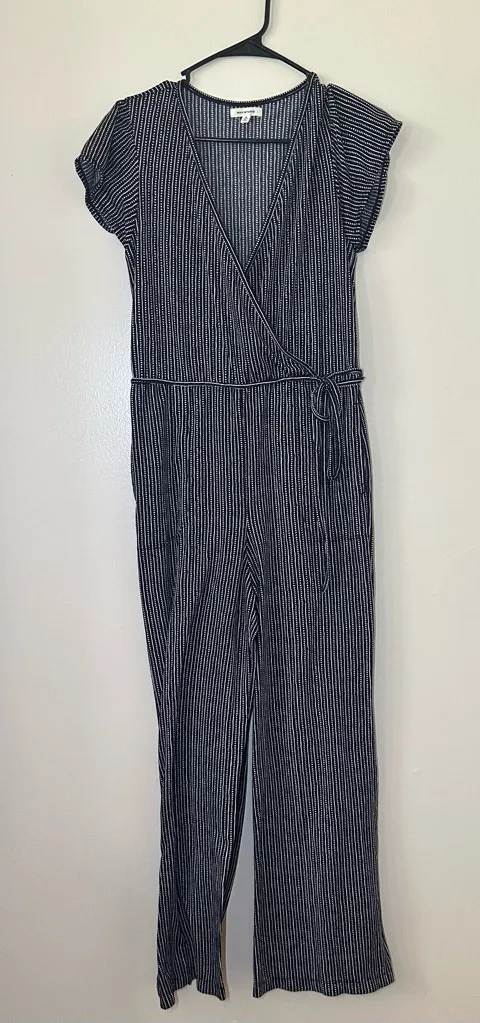 Chic jumpsuit with a wrap front. Features cap sleeves and a tie waist. Perfect for any occasion.