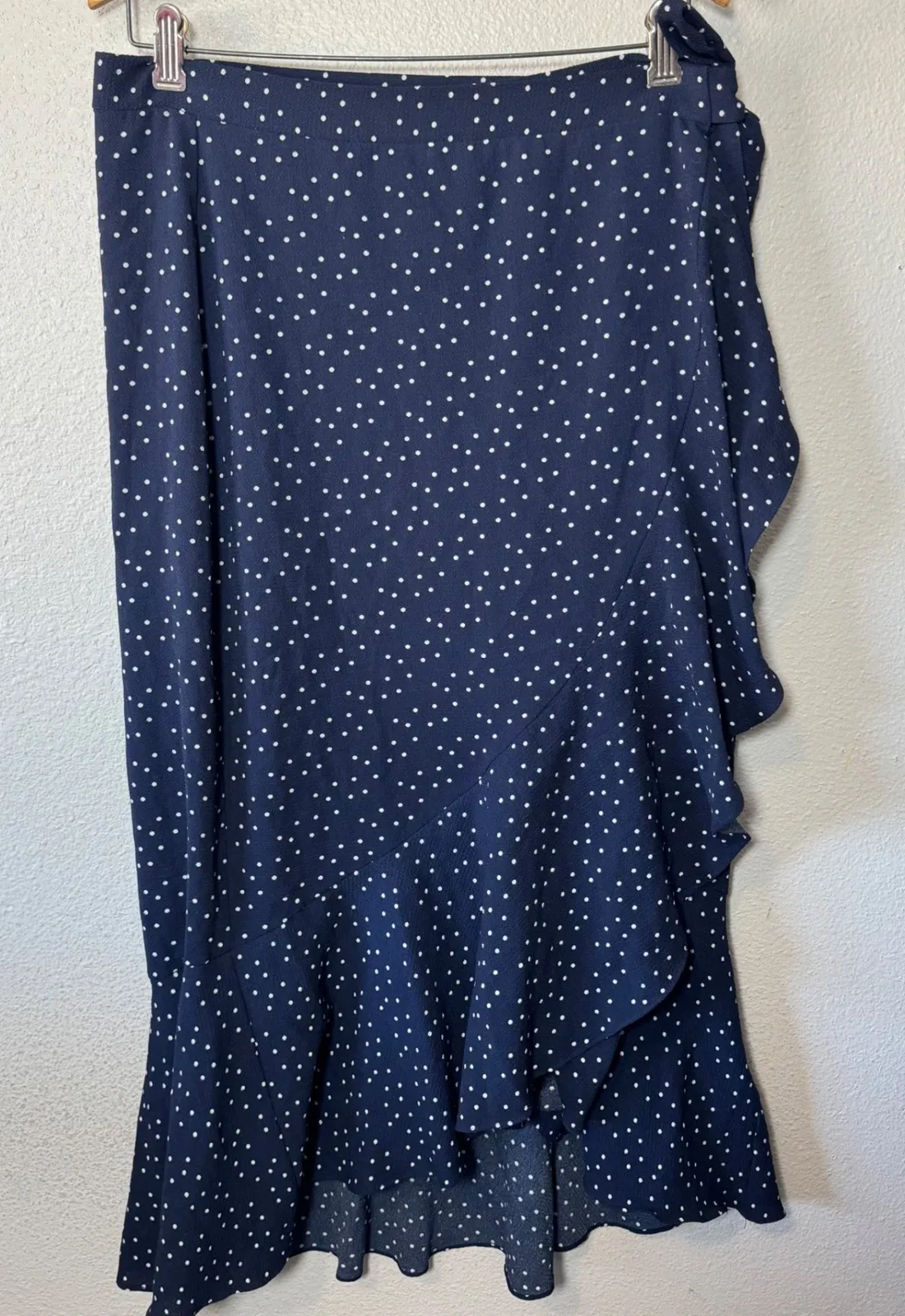 A navy blue midi wrap skirt adorned with a classic white polka dot pattern. This skirt features a fl... Show more