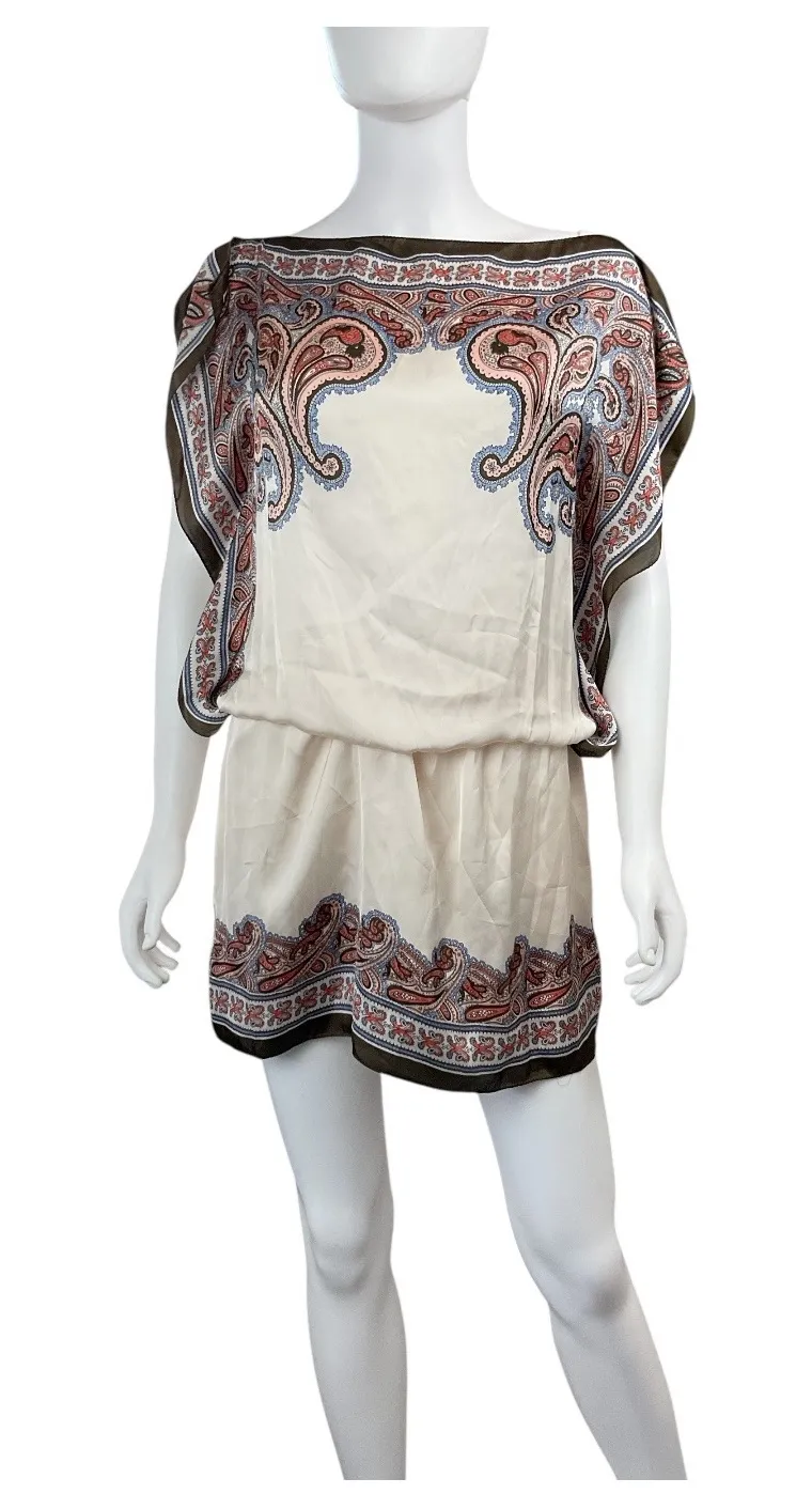 Keywords: Max Studio, Paisley Dress, Mini Dress, Boat Neck Dress, Cream Dress, Womens Dress, Bohemian Style, Casual Dress, Summer Dress, Party Dress, Size M, Short Dress, Boho Dress, Designer Dress