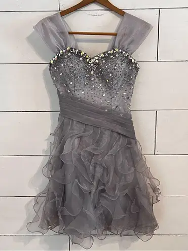May Queen Gray Ruffle Rhinestone Formal Dress. •Size 4 •In excellent used condition. Only worn once.... Show more