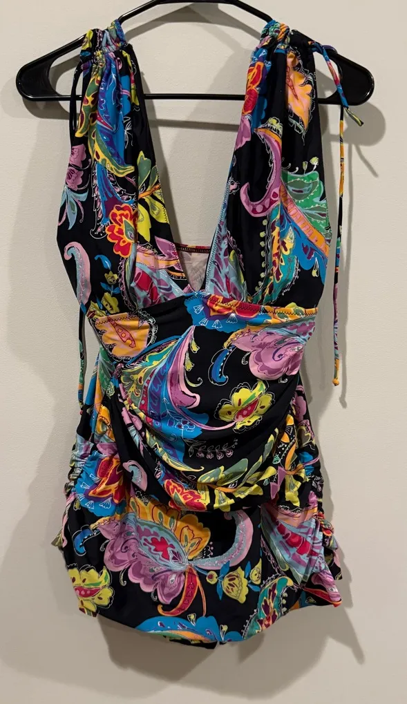 If you have any more Q’s feel free to ask, I’d love to answer them for you! Mazu Swim women’s one-piece swimsuit size 14, colorful tropical print swimwear, supportive bust design, flattering tummy control fit, vibrant summer beachwear, adjustable straps for comfort, stylish and functional swim suit, Mazu Swim women’s fashion, perfect for pool or vacation, sleek and vibrant one-piece bathing suit, size 14 women’s swimwear.