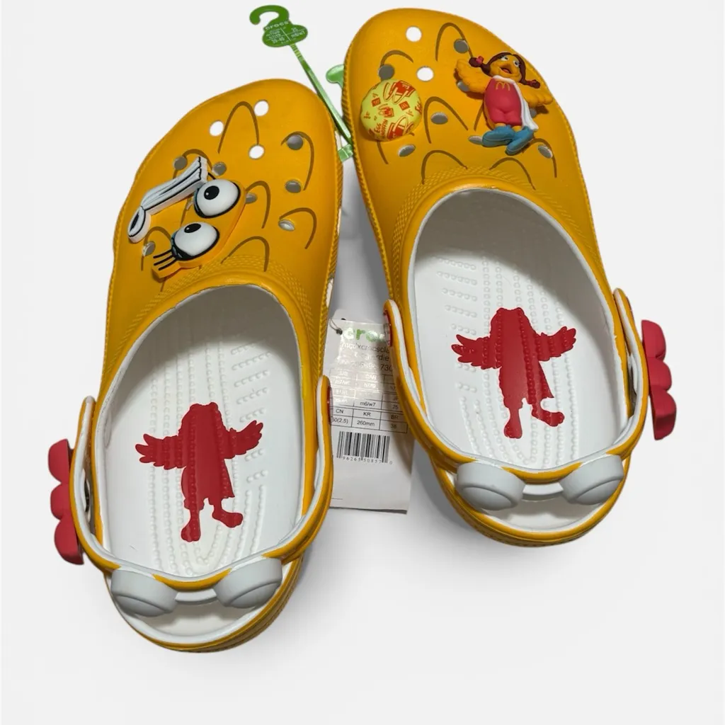Bright yellow sandals with fun cartoon characters. Comfortable and playful design. McDonald's × Cro... Show more