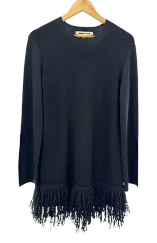 Sophisticated and edgy black knit sweater by McQ Alexander McQueen, featuring a soft wool-blend body with dramatic fringe trim at the hem. This longline silhouette can be styled as a tunic or mini sweater dress. Sleek 3/4 sleeves with small side slits add subtle movement. Size: Large Length: 38" Pit to Pit: 22" Sleeve: 27" Color: Black Material: Body: 100% Wool Trim: 49% Acrylic, 23% Wool, 22% Polyamide, 4% Viscose, 2% Mohair Care: Professional dry clean only Made in: China Condition: Excellent pre-owned condition with minimal signs of wear. No holes or snags noted. McQ Alexander McQueen sweater dress, black wool fringe sweater, designer fringe hem tunic, minimalist luxury knitwear, avant garde pullover, runway style, longline sweater, British designer, Y2K grunge chic, elevated layering piece