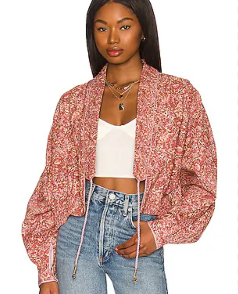 This is a open front Free People jacket with tie option. It has blouson sleeves, elastic waist and b... Show more