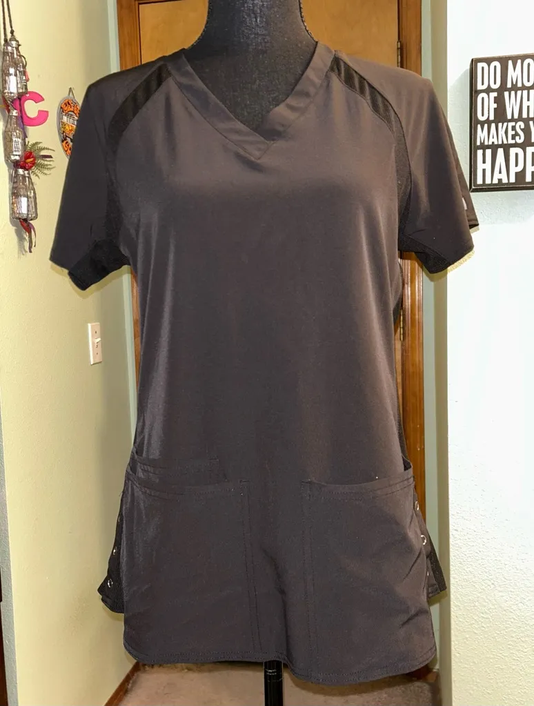 Med Couture Peaches black v-neck scrub top size S. Item is has ribbed sides and snap closures at the side. Three pockets in the front. Lightweight, stretchy and moisture wicking. I saw no flaws on this item. Measurements in pics.