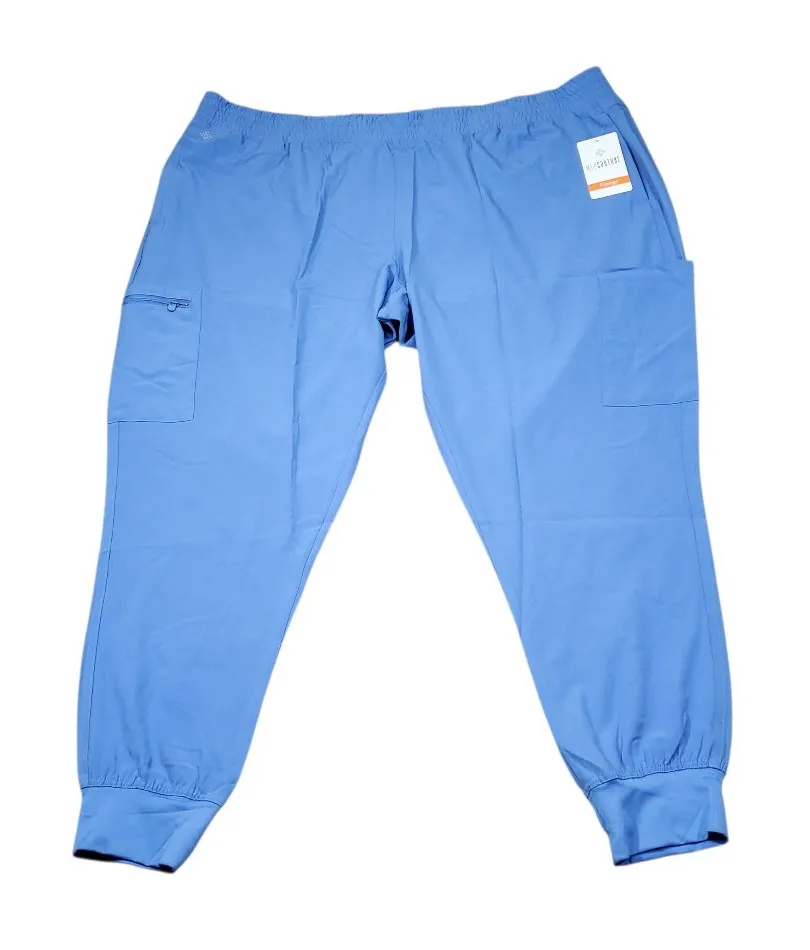 Women's MedCouture Energy Smocked waist cargo jogger scrub pants in light "Ceil" blue. Style number 8739. New with tags, but has a pull on the back of one of the legs as shown in photo. Women's plus size 3XL, real measurements shown in photos with pants laid flat: Waist approx 23" Inseam approx 29.5"