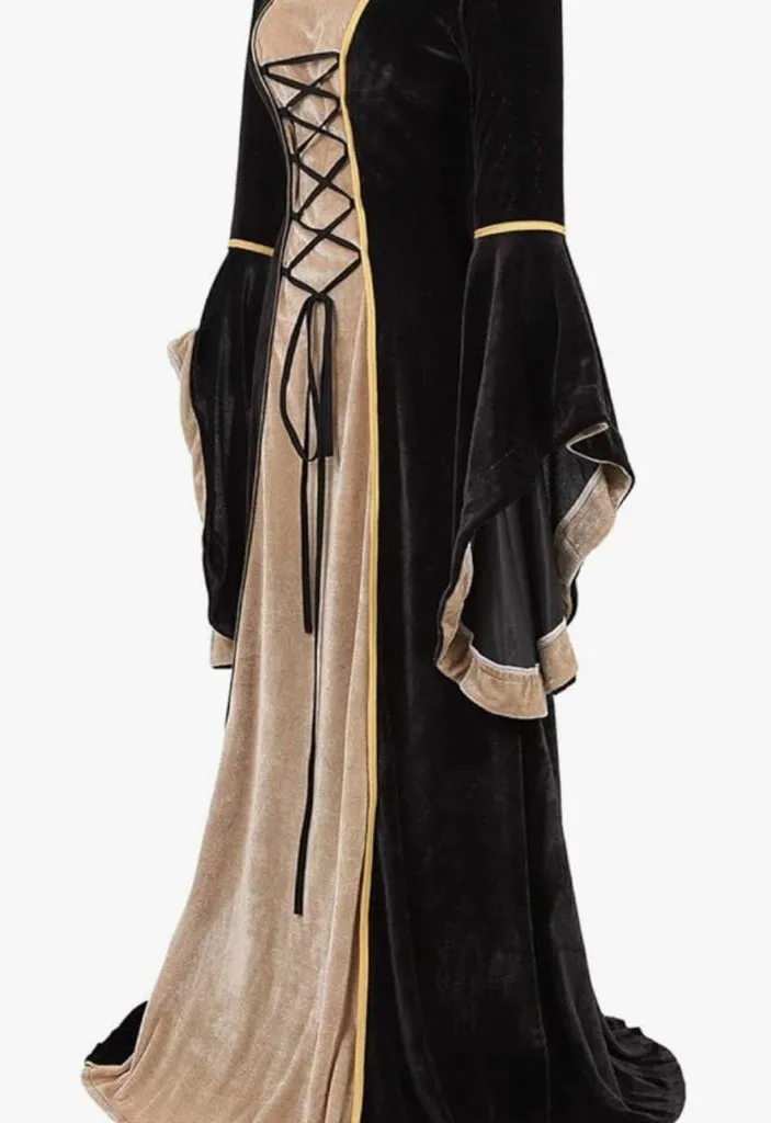 Make a dramatic entrance in this enchanting long sleeve maxi dress featuring a striking corset-style bodice and flowing bell sleeves. The luxurious black velvet contrasts beautifully with tan panels, while gold trim adds a regal touch. The lace-up front and dramatic sleeve design create a captivating silhouette perfect for renaissance fairs or themed events. You can corset the front or the back of the dress!pit to pit 20”