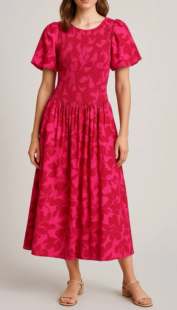 Brand: ME+EM Size: UK 6 / US 2 / EU 34 Style: Smocked floral midi dress Color: Pink and red floral print Features: Smocked bodice, puff sleeves, gathered skirt, lightweight breathable fabric Fabric: 100% Cotton (Main + Lining) Care: Machine wash cold, turn inside out before cleaning, reshape while damp, iron on reverse Condition: Excellent, gently pre-owned.
