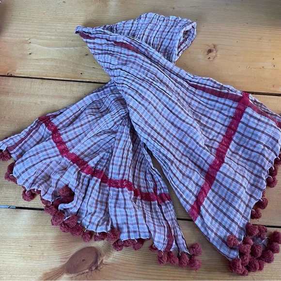 Designer Meg Cohen Scarf crafted from a soft cotton silk blend offering a lightweight and breathable feel. The cream and red plaid pattern is elevated with adorable lace detail and Pom Pom tassel trim. Made in India 24” x 36” Generous size - can be styled in a number of ways Condition: Excellent pre-owned, no flaws