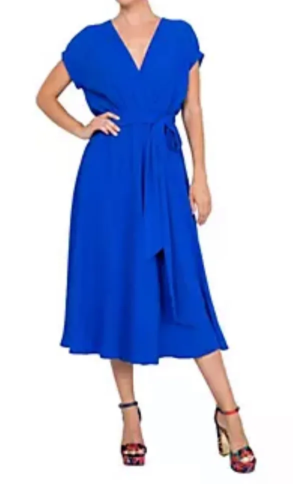 Dress is brand new with tags and comes from a smoke free home. * Meghan Los Angeles * size Small * Jasmine midi dress * Royal Blue * Elastic waistband * V-neck * Cap sleeves * Lined * tie belt * approximately 18” flat across the chest * 51” long * brand new; never worn