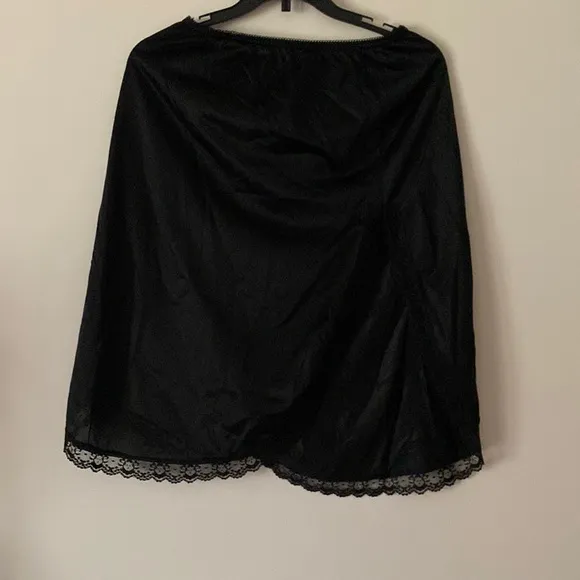 Mei Lin 1980’s black waist half slip knee length midi side slit small black waist half slip knee length Elastic good No issues 12 inches across, max stretch 19 inches across length 23 inches Great condition Smoke free home Tags Silky satin sexy retro Lacey slip dress Layering cosplay Questions? Leave a comment below!