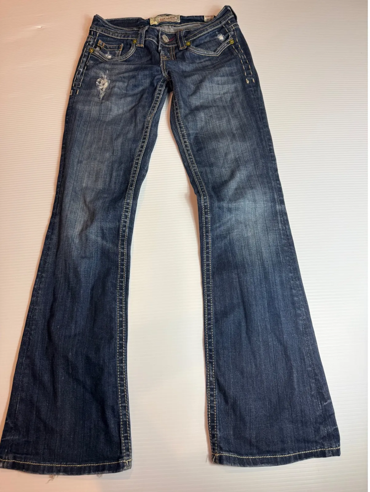 Stylish MEK Denim Kaikoura boot cut jeans, a perfect blend of comfort and edgy design. These jeans feature a flattering boot cut silhouette and a dark wash that adds a touch of sophistication. The distressed detailing gives them a modern, lived-in feel, while the intricate stitching on the back pockets adds a unique, eye-catching element. These jeans are ideal for casual outings, weekend adventures, or adding a touch of flair to your everyday wardrobe. Measurements: • Inseam: 32 inches • Waist: 26 inches Style: Bootcut Color: Blue Department: Women Type: Jeans Fabric Wash: Dark Accents: Button, Logo, Embroidered Features: Distressed, Pockets Waist Size: 26 in Pattern: Solid Fabric Type: Denim Inseam: 32 in Material: Cotton, Cotton Blend Closure: Button, Zip Keywords: MEK Denim, Kaikoura, Boot Cut Jeans, Womens Jeans, Size 26, Distressed Jeans, Dark Wash Jeans, Designer Jeans, Casual Jeans, Fashion Jeans, Denim Jeans, Y2K Jeans