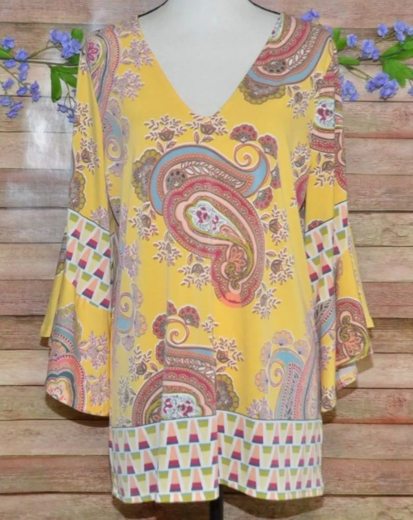This Melissa Paige tunic blouse features a butter yellow background with a colorful paisley print, 3... Show more