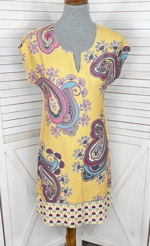 Melissa Paige Reversible Paisley Strokes Stripes Shift Tunic Dress Size Petite Small PS Scuba knit fabric Shift tunic style Cap sleeve Yellow with pink teal lime multicolor paisley Geometric contrasting hem Exposed reversed seams Aqua teal peach yellow paint stroke abstract stripes Pullover Knee length Excellent preowned condition Armpit to armpit 16” Length shoulder to hem 34” Summer Casual Resort Colorful Office Travel Vacation #459”