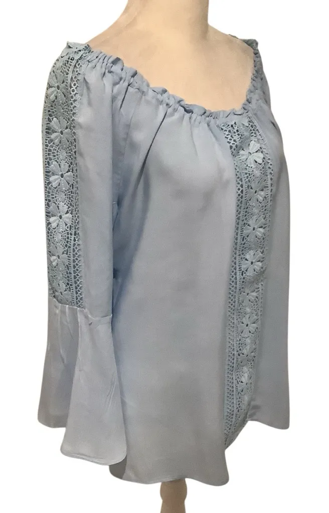 Charming sky blue peasant top with ruffle accents. Beautiful lace crochet detail. High end blouse. SEE MATCHING PALAZZO Melissa Paige pants. Perfect for casual outings. Or dress up. Nice for Spring or Summertime. Brand new with tags