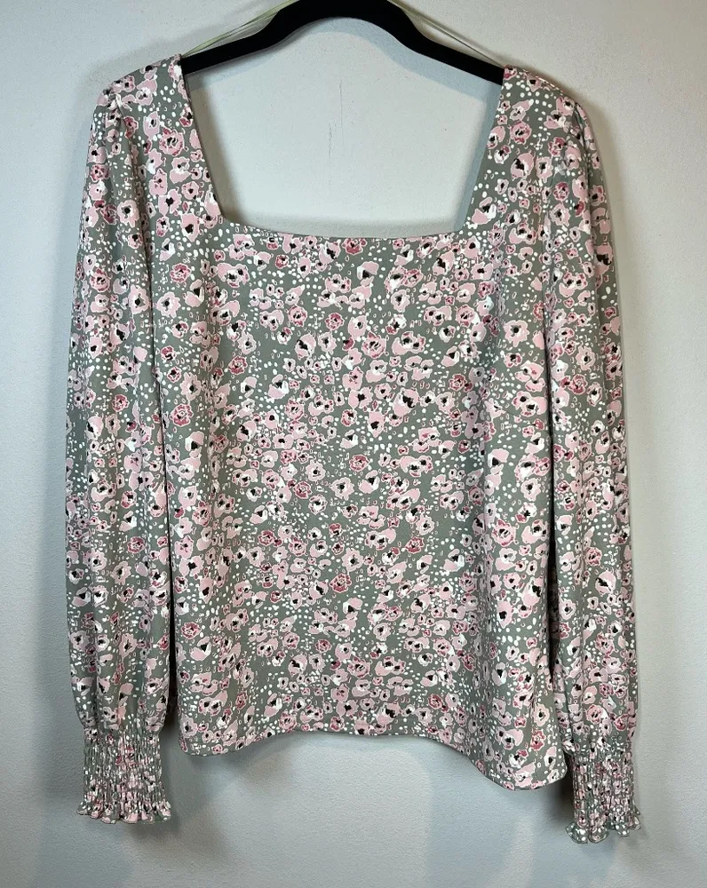 Melloday Ditsy Floral Square Neck Blouse Shirt Sage Green Pink Pullover Long Sleeves with Smocked Cuffs Pleats At Shoulders Straight Hem Stretch Cottage Core Women's size XL Preowned in excellent condition. No noted flaws. Approximate measurements: unstretched 24 in top of shoulder seam to bottom hem length, 16 in shoulder seam to seam, 21 in underarm to underarm seam 95% polyester 5% spandex Made in China Hand wash SKU307