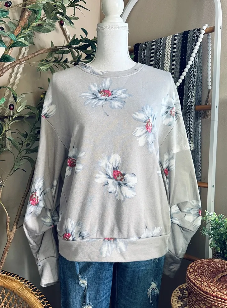 ** 🌸 Elevate your casual look with this chic Melloday sweatshirt featuring a soft gray base and delicate floral print. The ruched sleeves add a stylish, feminine touch that makes it perfect for dressing up or down. Lightweight yet cozy — ideal for layering year-round! **Details:** * Brand: Melloday * Color: Gray with floral pattern * Ruched long sleeves * Relaxed * Soft, comfortable fabric **Style Tip: Pair with jeans and sneakers for a cute everyday outfit or dress it up with trousers and booties for an effortlessly polished look. **Condition:** GUC - there is a teeny tiny pull near neckline and teeny hole in under arm as shown but not noticeable unless really looking for it. Size medium Approx measurements lying flat Pit to pit 21.5” Length 24”