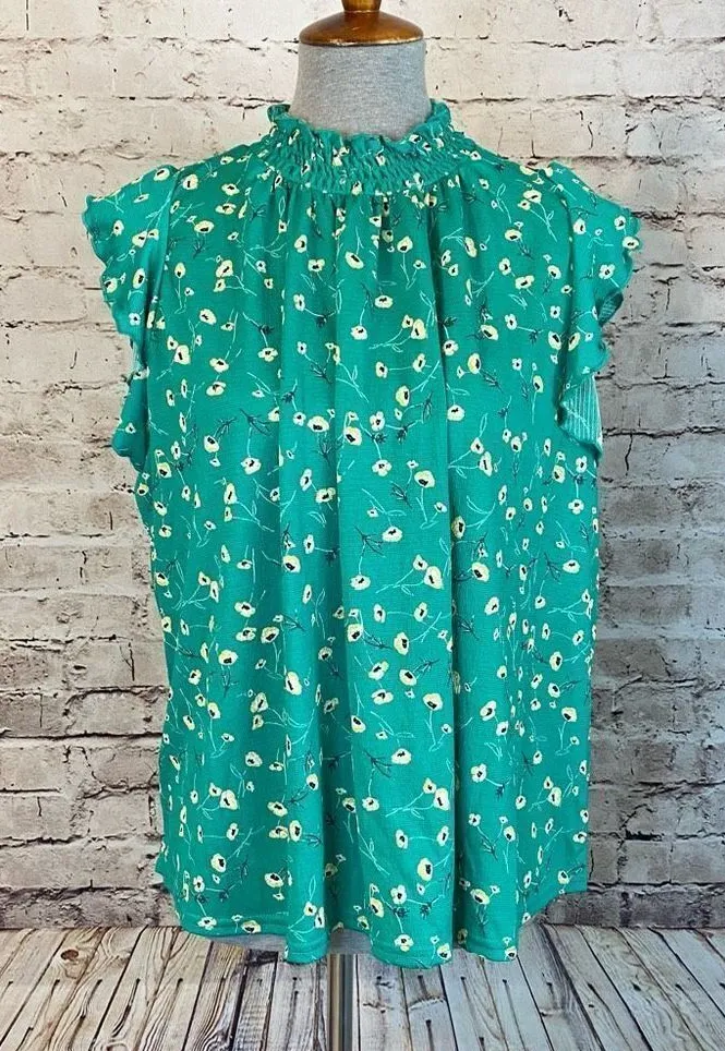 Melloday Green Floral High Neck Flutter Cap Sleeve Loose Fit Top Blouse Size XL Approximate flat lay measurements are: 24” Bust pit to pit, 24” Long shoulder to hem Please use these measurements against a top you already own to determine best fit.