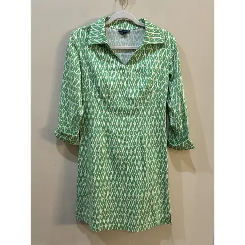 The Melly M Dress in size 4 is a stylish and versatile green geometric dress perfect for various occasions. This preppy resort-inspired dress features a collared neckline, 3/4 sleeves, and a pullover closure for easy wear. Made from a lightweight and stretchy nylon-spandex blend, this short dress offers comfort and flexibility. Whether you're traveling, attending a party, or working, this A-line shift dress with a pencil or sundress style is sure to make a statement with its designer beach-themed design. 2228. 4200