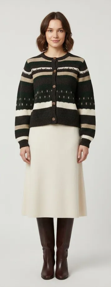 A must-have piece for elevated cold-weather style. This beautiful button-front cardigan features a sophisticated, earthy color palette of deep forest green, cream, olive, and espresso brown, rendered in a striking multi-stripe and subtle Fair Isle-style pattern. The cozy, mid-weight knit makes it perfect for layering, while the slightly ballooned sleeves add a modern touch to the classic silhouette. Pair it with a tailored midi skirt, trousers, or your favorite vintage denim for a look that is effortlessly chic and warm. Length 22” Pit to pit 20” with lots of stretch Under pit to cuff sleeve length 19” 60% Cotton 40% Acrylic The sweater is brand new without tags.