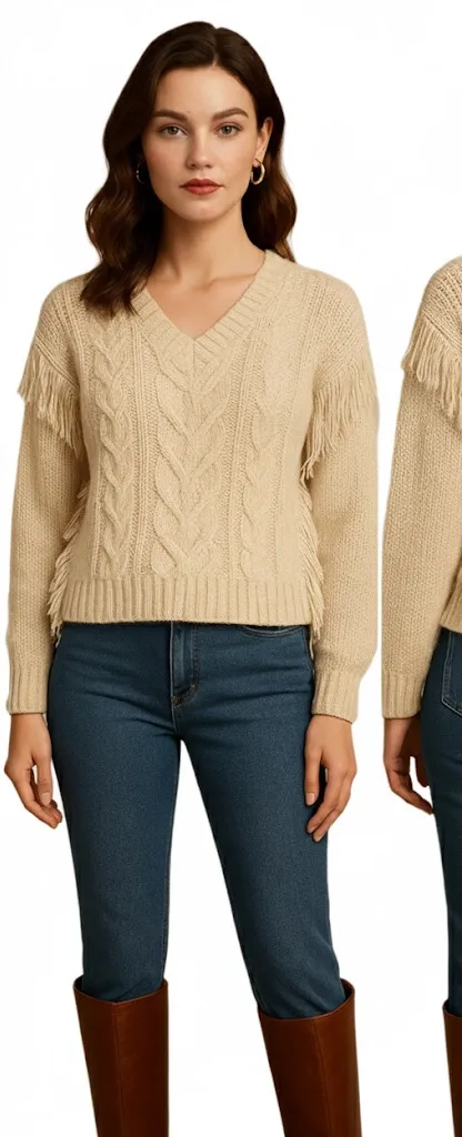 Stay cozy and stylish with this cream cable knit sweater. Perfect for any occasion, this sweater off... Show more