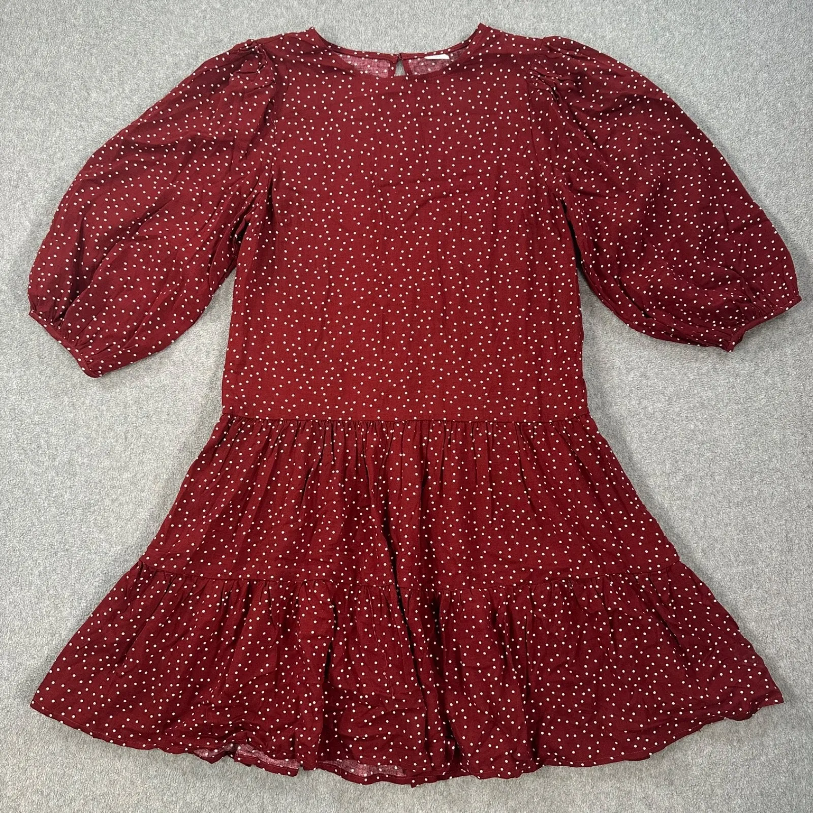 Size: XS Condition: Very Good Pre-Owned Condition, No Rips,Stains, or Tears.Please see all photos for most accurate representation of condition Color: Burgundy, White Closure: Keyhole Button on Back of Neck Pockets: No Material: 100% Rayon Sleeve Length: 3/4 Sleeve