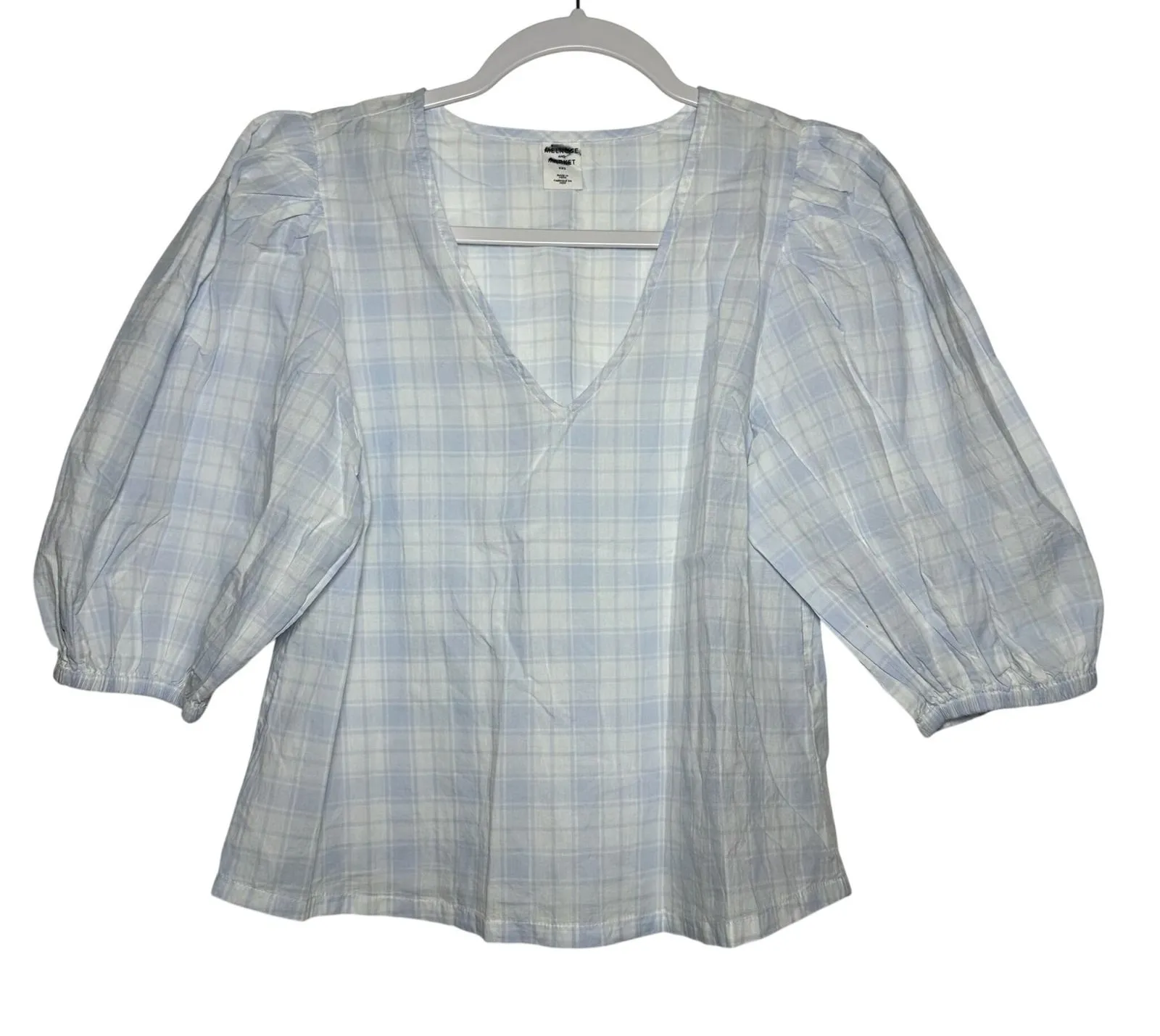 Melrose and Market women's blouse featuring a light blue and white plaid pattern. This top has a flattering V-neckline and stylish puff sleeves that end at the elbow. The fabric has a textured appearance, adding depth to the design. There are several Sharpie marks present on the garment, particularly on the front and sleeve areas. Measurements: • Bust (Armpit to Armpit): 17" • Length: 20" Type: Blouse Department: Women Style: Tunic Material: 100% Cotton Neckline: V-Neck Sleeve Length: 3/4 Sleeve Sleeve Type: Puff Sleeve Pattern: Plaid Features: Lightweight Fit: Regular Fabric Type: Woven Occasion: Casual Closure: Pullover Season: Spring, Summer Garment Care: Machine Washable Country of Origin: India Keywords: Melrose and Market, plaid blouse, puff sleeve, V-neck, blue and white, textured, casual top, women's shirt, elbow sleeve, lightweight, preppy, academia Fast shipper- most items ship within 1 day!