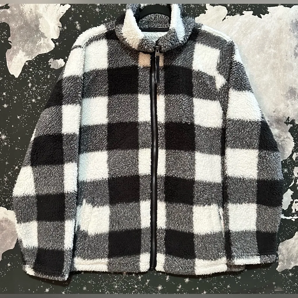 Members Mark Cozy Sherpa Soft Warm Lightweight Fleece Jacket, color is black/white with buffalo plaid pattern & front zip closure. Good condition Sz. XL Measurements (24”x27” / Sleeve 24”)