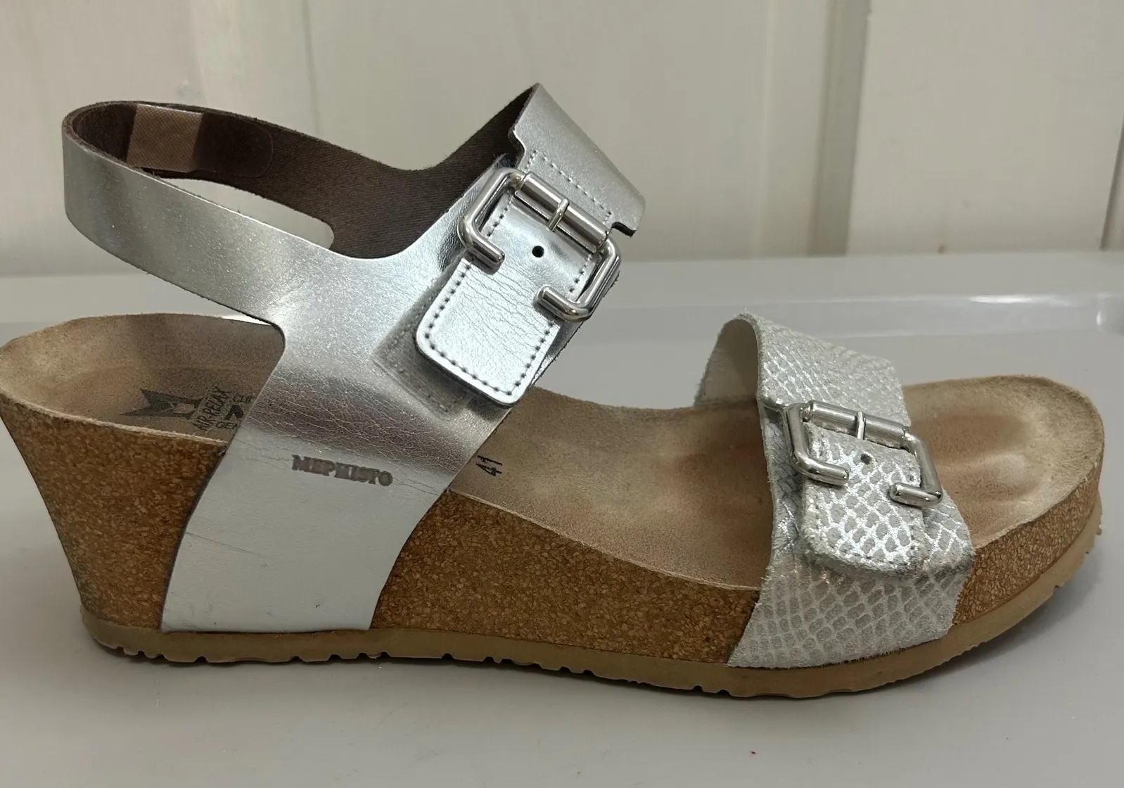 Style: Strappy Department: Women Upper Material: Leather Heel Style: Wedge EU Shoe Size: 41 Features: Ankle Strap, Straps, Adjustable Strap, Buckle, Cushioned Closure: Buckle Pattern: Animal Print Accents: Logo Type: Sandal Product Line: Mephisto Insole Material: Cork These are only worn a couple of times and just have a little darkening on the shoe bed. Keywords: Mephisto, sandals, wedge, cork, silver, leather, strappy, European size, comfortable, walking, summer, casual, air relax, dressy sandals, comfort shoes