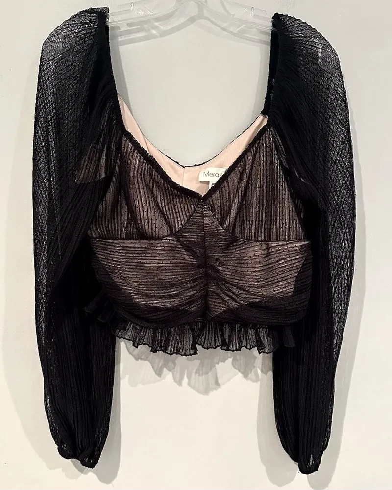 Meraki Illusion Ruched Crop Top Women's XL Black Lined Sweetheart Neckline. Excellent, pre-owned condition. Machine wash. Ships from a non-smoking home. Measurements: PTP: 20" Length: 17" Sleeves: 24"