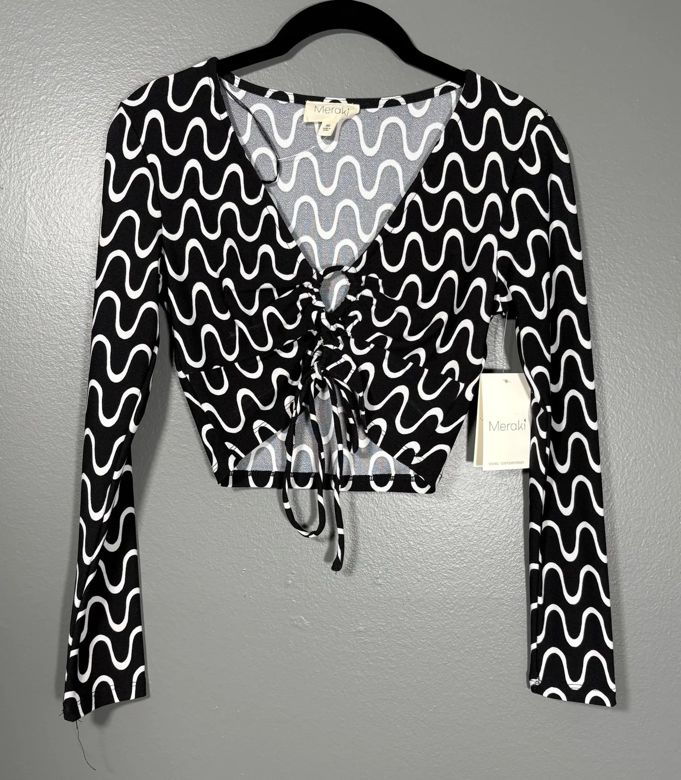 Women's NWT 90's club style crop top by Meraki. This black and white top has a wave pattern, long sleeves, and a tie in the front. It is a polyester spandex blend. The top is a size XS. When laying flat it measures approximately: Armpit to armpit: 16 inches Length: 15 inches The top is brand new with tags.