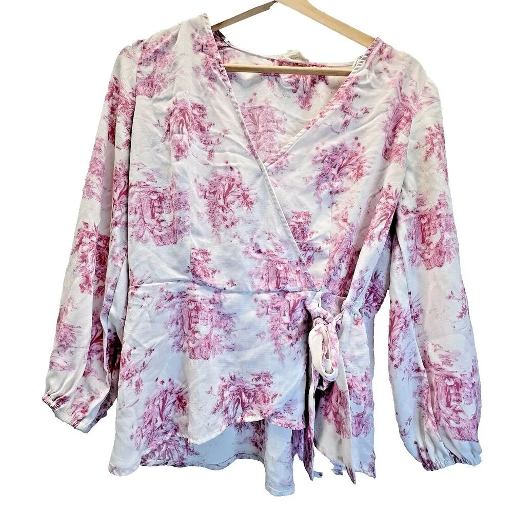 Meraki Wrap Top Peplum Tie Pink Top Blouse Coquette women Ballet core L Pre-owned Size L Color pi... Show more