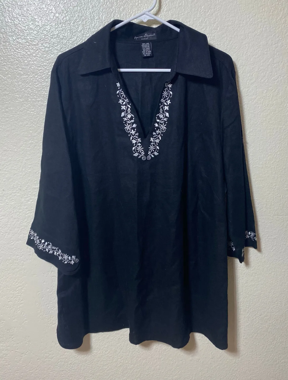 Mercer & Madison 100% Linen Black Tunic Blouse White Embroidery V Neck Size 24W - $25 - From Erica