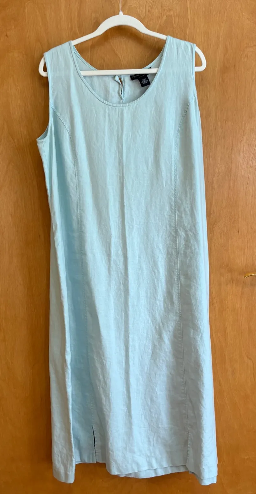 A gentle breeze of style is captured in this refreshing linen maxi dress. This summery piece features a clean sleeveless design, perfect for warm weather days. The streamlined silhouette is subtly shaped with vertical seam details, leading to charming side slits at the hem. A sweet button closure at the back adds a touch of delicate detail. This dress is ideal for a relaxed brunch with friends, a casual summer wedding, or simply strolling along the beach at sunset. Measurements: • Sleeveless Width: 24 in Style: Maxi, Tank Dress, Sundress Dress Length: Long Color: Blue Department: Women Sleeve Length: Sleeveless Pattern: Solid Occasion: Casual, Travel Material: Linen Neckline: Round Neck Character: Retro, Coastal Chic, Summer Vibes, Beach, Casual Fabric Type: Woven Season: Spring, Summer Sleeve Type: Strapless Keywords: linen dress, maxi dress, sleeveless dress, summer dress, light blue dress, plus size dress, 20W, Mercer & Madison, casual dress, beach dress, vacation dress, women's dress, linen maxi dress, side slit dress