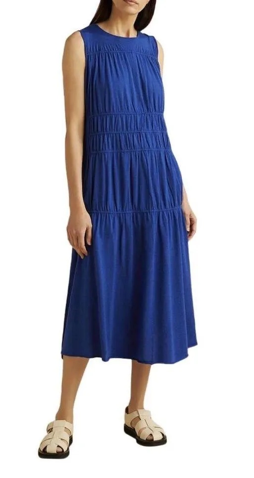 The Margriet dress is made of a soft, lightweight cotton-blend knit with ruched cording between tiers. The dress hits mid-calf. Pullover style, unlined. Sleeveless • This garment can be dry cleaned or hand-washed and laid flat to dry. • 80% Cotton, 20% Polyamide About Merlette: Merlette is a Brooklyn based atelier creating thoughtfully designed garments with the modern woman and her everyday life in mind. Merlette was founded in 2016 by designer Marina Cortbawi, with a dedication to refining shape, texture and details into a sense of empowered femininity by creating garments that allow women to feel elegant and at ease.