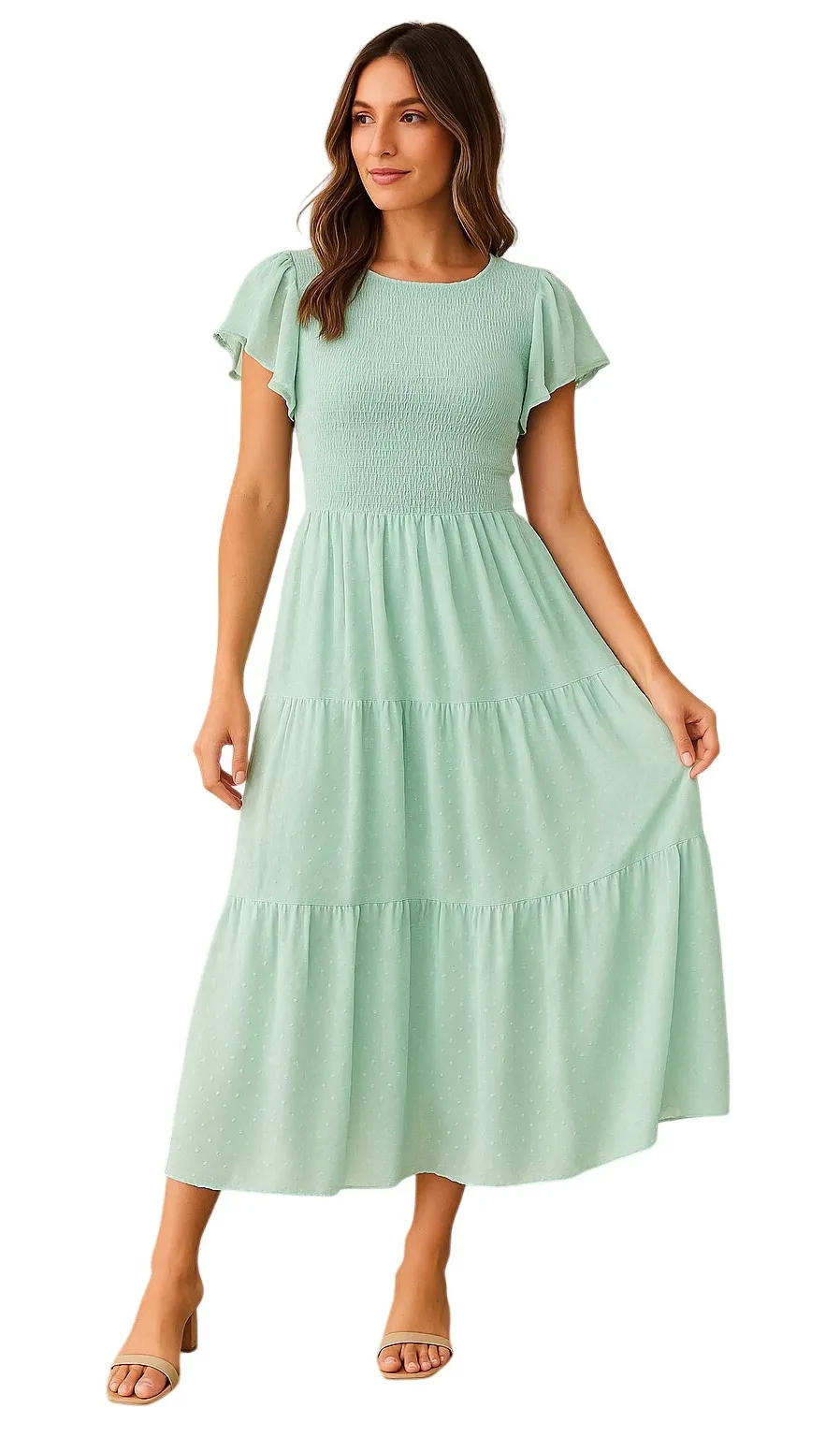 MEROKEETY Mint Green Smocked Bodice Tiered Midi Dress – Size Large This MEROKEETY mint-green midi dress features a stretchy smocked bodice, flutter sleeves, and a tiered skirt with Swiss-dot texture. Soft, lightweight, fully lined, and perfect for spring events, family photos, or everyday casual wear. Back keyhole button closure. Very flattering and comfortable fit with flexible stretch at the bust and waist. Measurements Shoulder: 14" Pit-to-pit: 16.5"–18.5" (stretch) Waist: 32"–36" (stretch) Hips: up to 50" Length: 50" Fabric: 100% Polyester Condition: Excellent pre-owned Color: Light mint green smocked dress, Swiss dot, flutter sleeve, midi dress, spring dress, tiered skirt, feminine, cottagecore, modest dress, photo-shoot dress