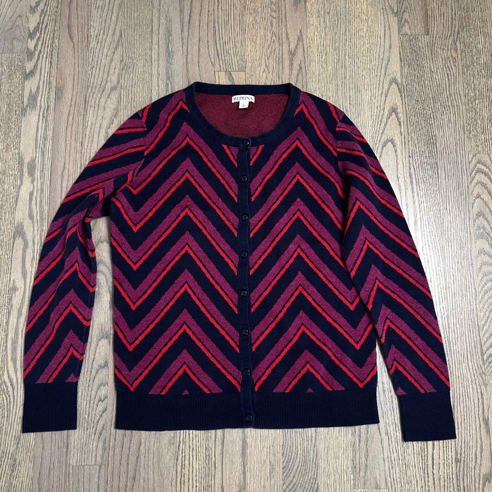 Keywords: Merona, cardigan, sweater, chevron, navy, purple, red, button down, cotton, womens, large, L, knit, long sleeve, geometric