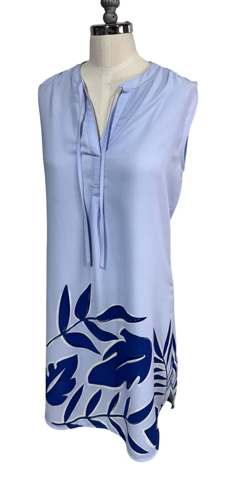 A Merona women's sleeveless tunic dress in a soft blue hue adorned with a striking navy leaf print.... Show more