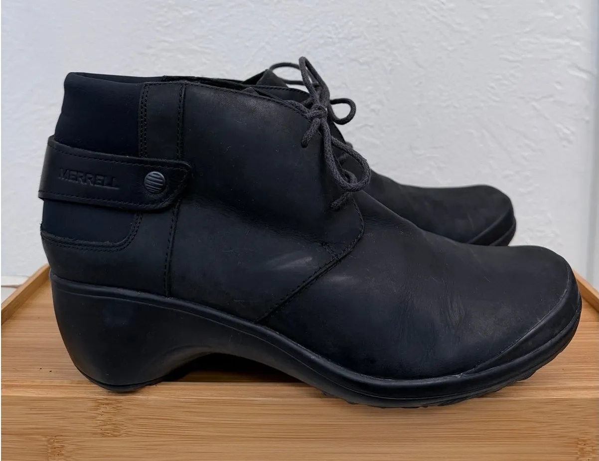 Merrell Women's Veranda ankle boots (model J42480) in sleek black leather. Lace-up closure, comfort wedge heel, and Merrell Select Grip rubber outsole for excellent traction. Pre-owned in very good condition with minor wear on uppers and soles. Details: • Brand: Merrell • Model: Veranda (J42480) • Size: US 10 / EU 41 • Color: Black • Material: Leather upper, rubber sole • Heel height: Approx. 2.25 in • Condition: Pre-owned – light wear only • Style: Ankle Boot / Comfort Wedge Perfect for casual wear, travel, or work. #Merrell #Veranda #AnkleBoots #LeatherBoots #WomenShoes #Size10 #ComfortWedge