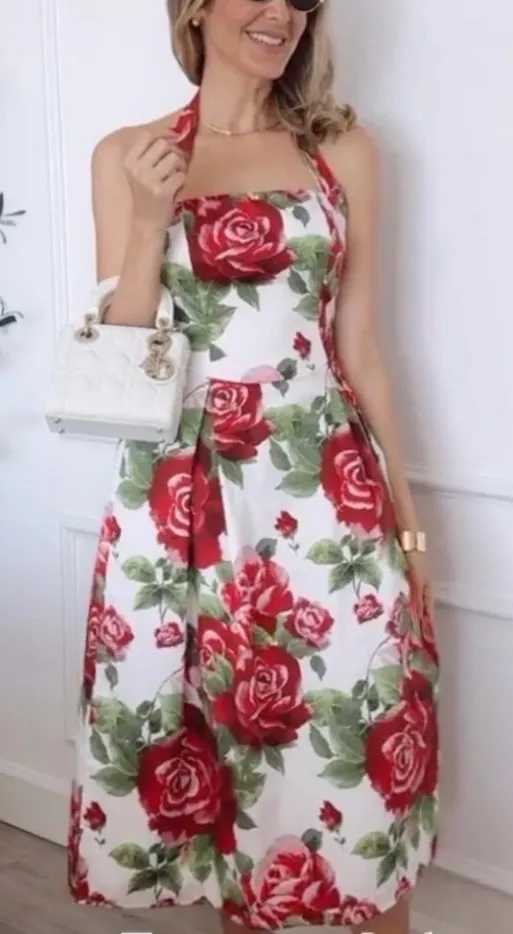 Chic floral dress with red and green pattern. Stylish and versatile. This Meshki dress is perfect for any summer event. Wedding, Kentucky Derby or just a night on the town. Floral design halter with clasp at neck. Size zipper. This is such a fun dress and NWT. Women’s size large