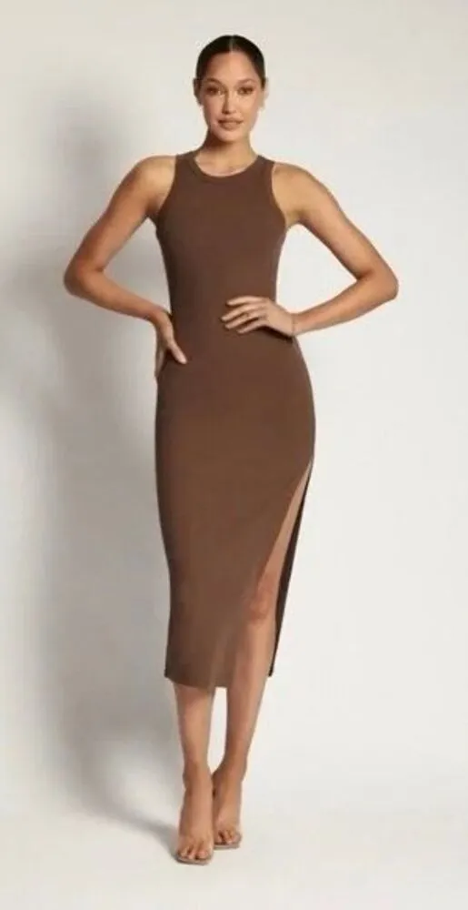 ✨MESHKI Viola Ribbed Racer Back Tank Midi Dress Size: Large Color: Latte Ribbed Throughout Structured Stretch Side Slit Midi Length Bodycon Fit Material: 85% Viscose 15% Elastane Retails: $115 BIN 45✨