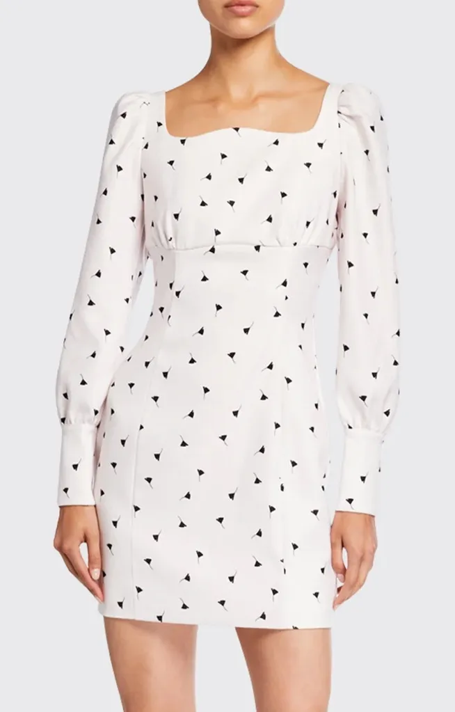 Mestiza New York Katrina mini dress in very pale blush pink with black print, puff sleeves and squar... Show more