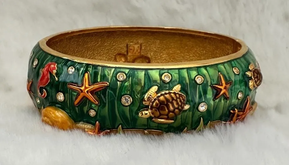 Preowned gently worn minor surface wear consistent with age no major flaws Metropolitan Museum of Art MMA enamel cuff bracelet featuring raised sea life motifs including turtle starfish and tropical ocean elements. Gold tone finish with textured green enamel. Collectible museum inspired piece originally sold through The Met Store. Signed MMA inside. • MMA Metropolitan Museum of Art • Sea Life turtle starfish design • Textured enamel • Gold tone • Collectible wearable art • Hinged cuff ocean tropical sea life turtle starfish reef marine coastal resort boho wearable art museum collectible