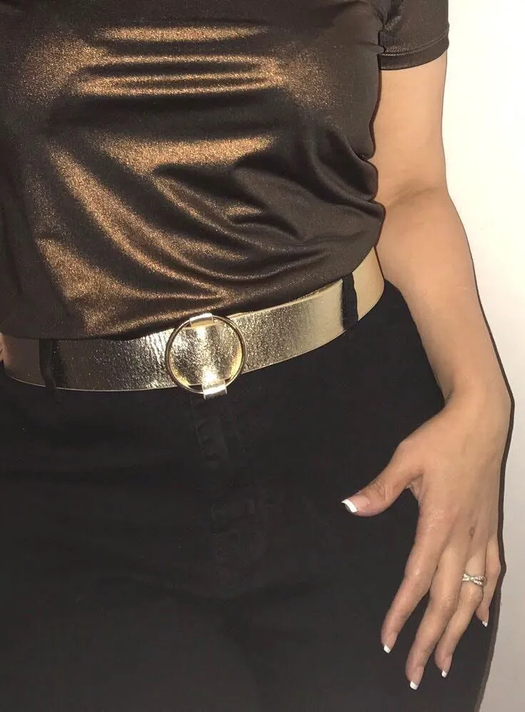 Metallic gold belt. Has gold circle hardware and metallic gold belt strap. Has never been worn besides to take photo! 49 1/2 inches in length 1 1/2 inches in width. Models waist is 30 inches
