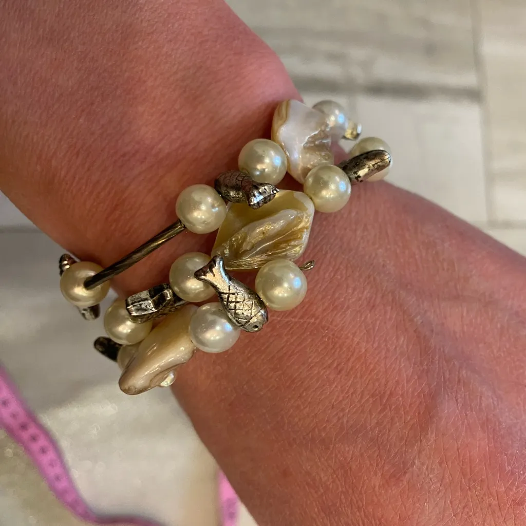 Vintage from the late 90s - Y2K time wrap bracelet, pearl-like beads with fish, shells, starfish and sea stones, wraps around to fit most wrists, some tarnish but otherwise in fair vintage condition Beach, vacation, ocean, sea, fish, neutral, metallic, accessories, jewelry, resort, y2k, vintage, natural