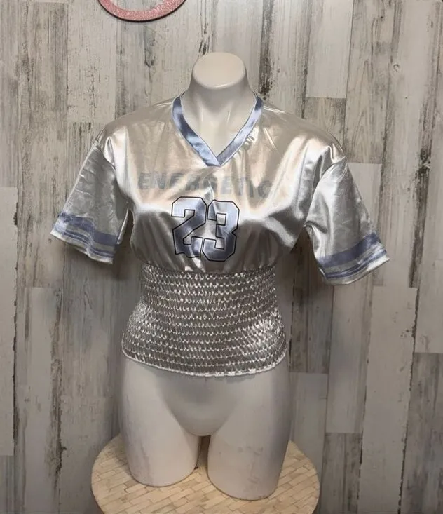 Size: S Measurements (approx using AI): • Pit to pit (chest): 17” • Length (shoulder to hem): 17” • Waist: 12” (stretches up to ~16”) Smoke-free home No rips No stains Ships fast — same or next day Open to offers or bundles! Measurements are estimated using AI based on mannequin fit. Please allow slight variation. Fabric: 92% Polyester, 8% Elastane Features: • Shiny metallic silver finish with light blue details • “Energetic 23” front print in sporty jersey style • Smocked waist for a fitted look • V-neck with contrast trim • Short sleeves • Lightweight and stretchy Keywords: metallic crop top, sporty jersey top, silver fashion top, Y2K style, streetwear outfit