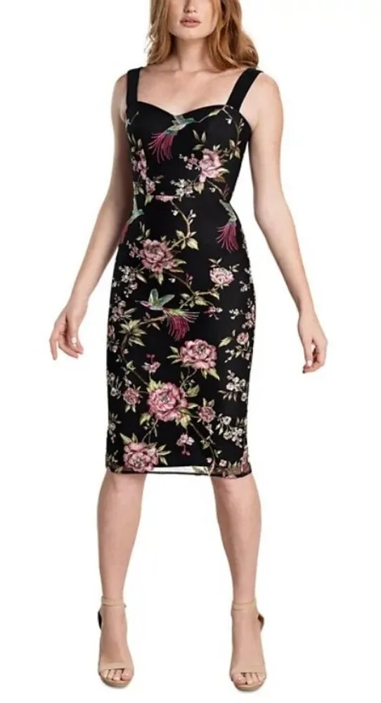 DRESS THE POPULATION Nicole Bodycon Dress Color: Black with Multi-Colored Embroidered Floral and Bird Print Style #: DDRB72-K659 Size: XL (14-16) Condition: New with Tags Make a floral-inspired statement in the Nicole dress from Dress the Population, a curve-hugging fit designed with a sweetheart neckline. Bodycon Midi Dress Fitted through the chest, waist, and hips Sweetheart neckline Bodycon silhouette Back zipper closure Lined Shell & lining: polyester Hand wash Cocktail Attire Cocktail Party Wedding Guest Fall Wardrobe Date Night Dinner Date Sexy Whimsigoth Whimsical Y2K 90s Goth Dark Feminine Romantic Figure Flattering Garden Party Special Occasion Boho Chic Bohemian